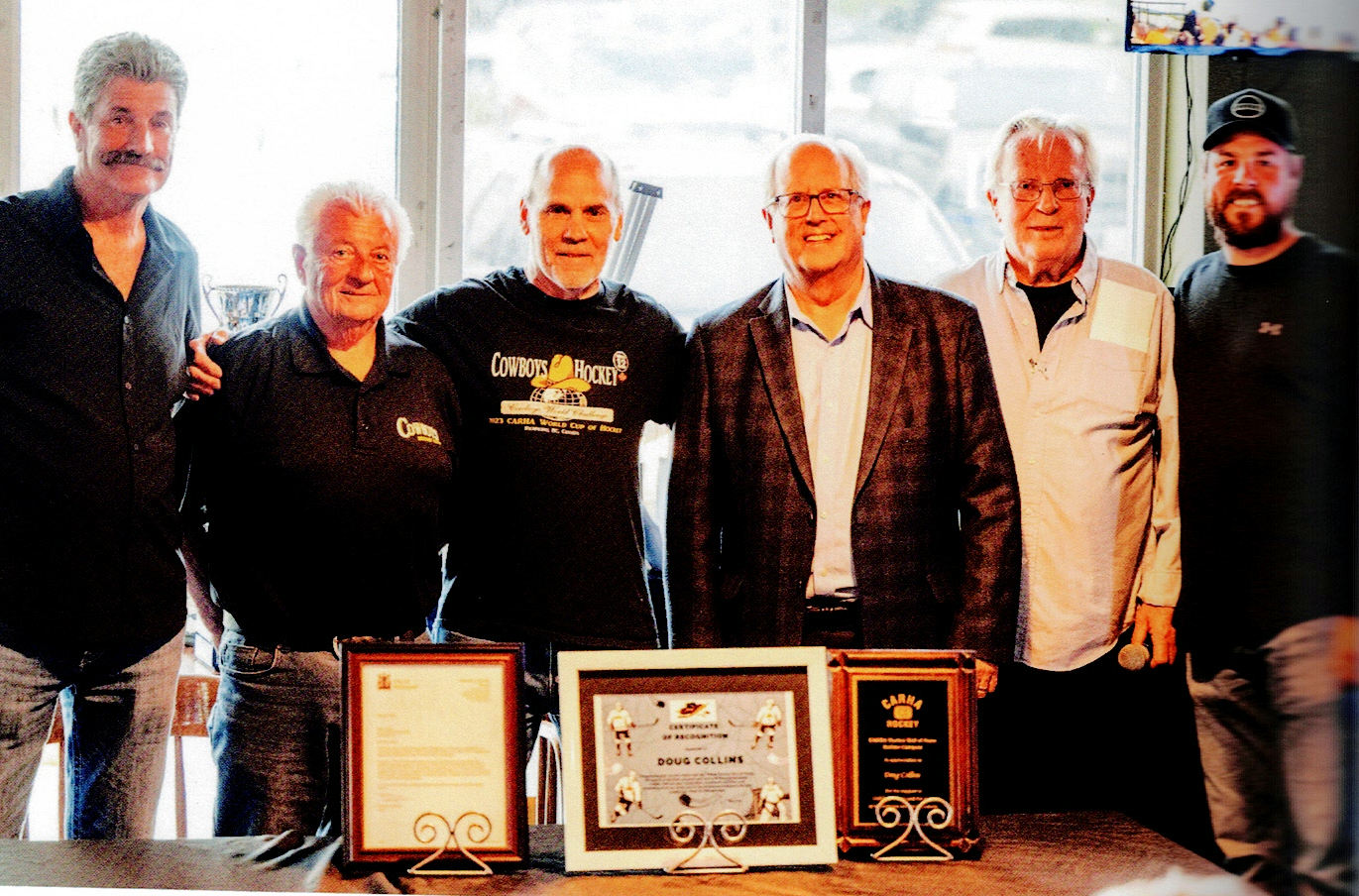 You see, Ed had been at work for the last year and a half petitioning to the Canadian Adult Recreational Hockey Association to induct Doug into their CARHA Hall of Fame. To do so required the support of the community and Ed had successfully gathered that, including the Mayor of Richmond. Mayor Malcolm Brody was kind enough to show up to help present a letter from the city to accompany a plaque from CARHA signifying the induction of Doug Collins into the CARHA Hall of Fame in the Builder category.
